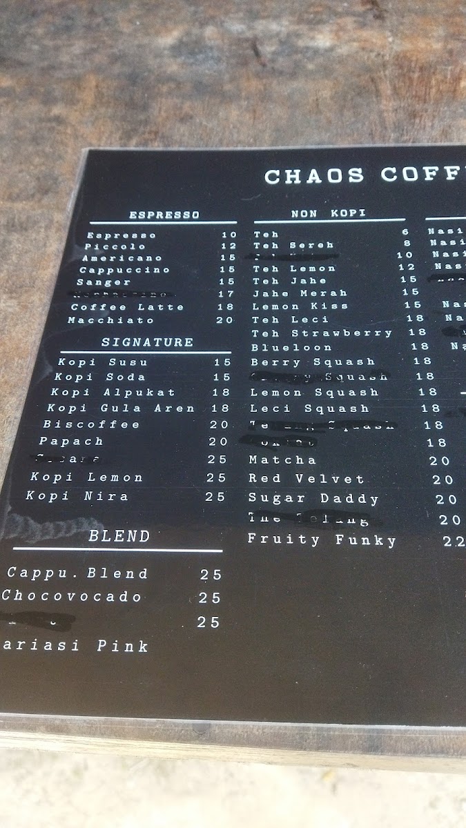 Welcome to Chaos Coffee & Space, a cozy haven nestled in Paya Bujok Tunong, Langsa City, Aceh. This charming coffee shop offers a delightful menu that perfectly blends the rich flavors of Acehnese coffee with a laid-back atmosphere, making it a prime spot for both social gatherings and introspective moments.